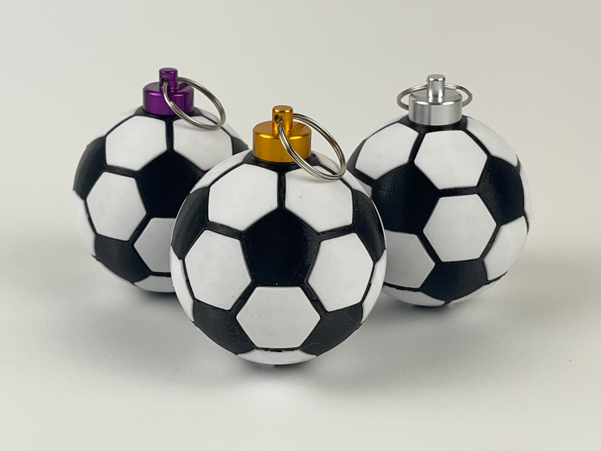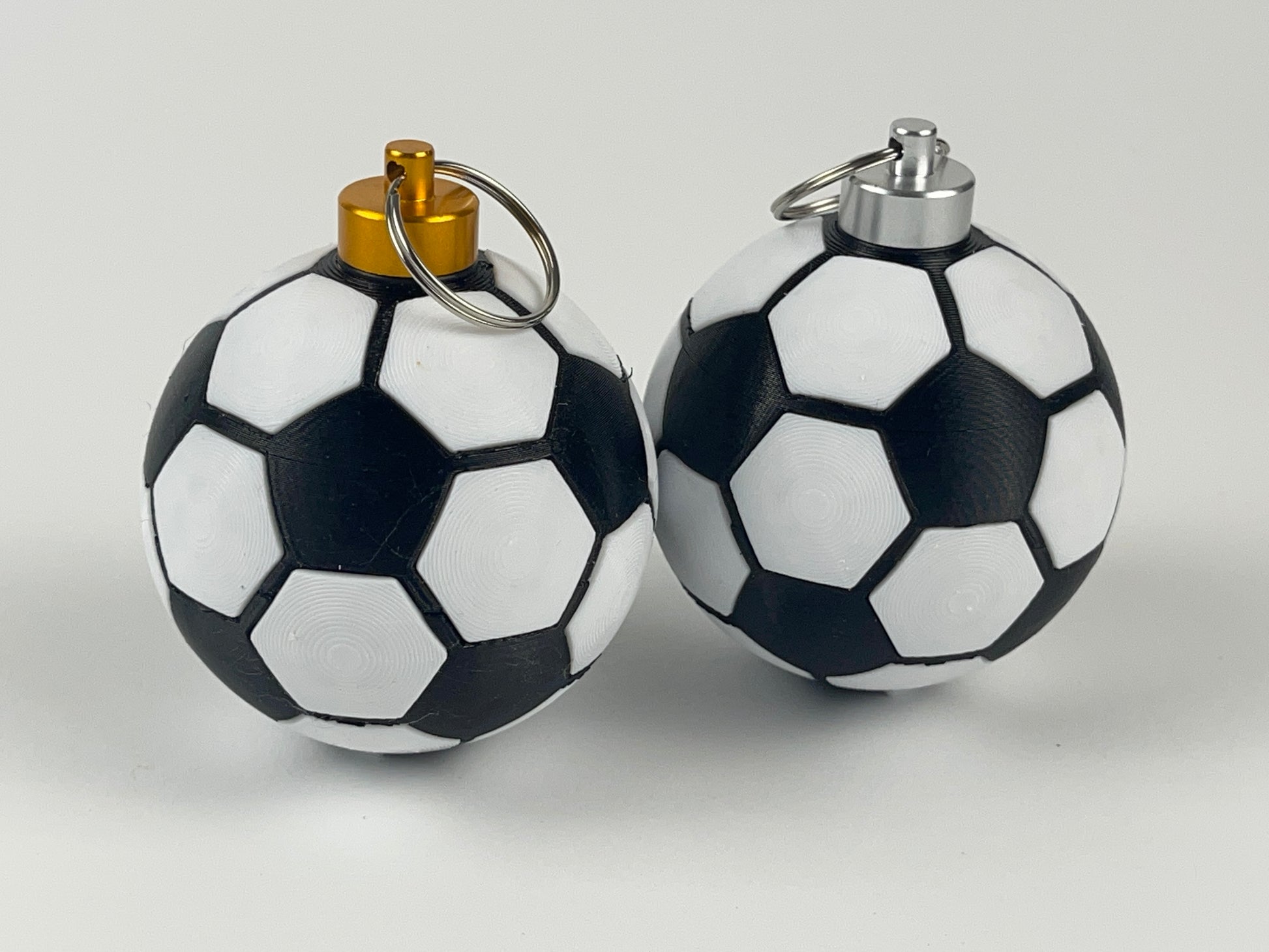 Dieser schöne Fußball dient nicht nur als Dekoration. Er beinhaltet einen eine Versteckmöglichkeit für Geschenke oder ein Geocaching-Logbuch. Der eigentliche Behälter ist eine Pillendose mit Dichtung. So kann keinerlei Flüssigkeit eindringen.